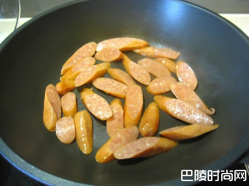 2德国香肠斜切成片,不用油,中小火两面煎熟