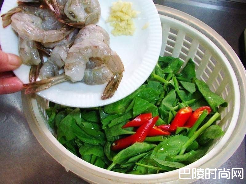 ...如照片图。豆苗将较粗纤维去除洗净ˊ辣椒切斜片ˊ姜切末ˊ虾子去壳留尾备用