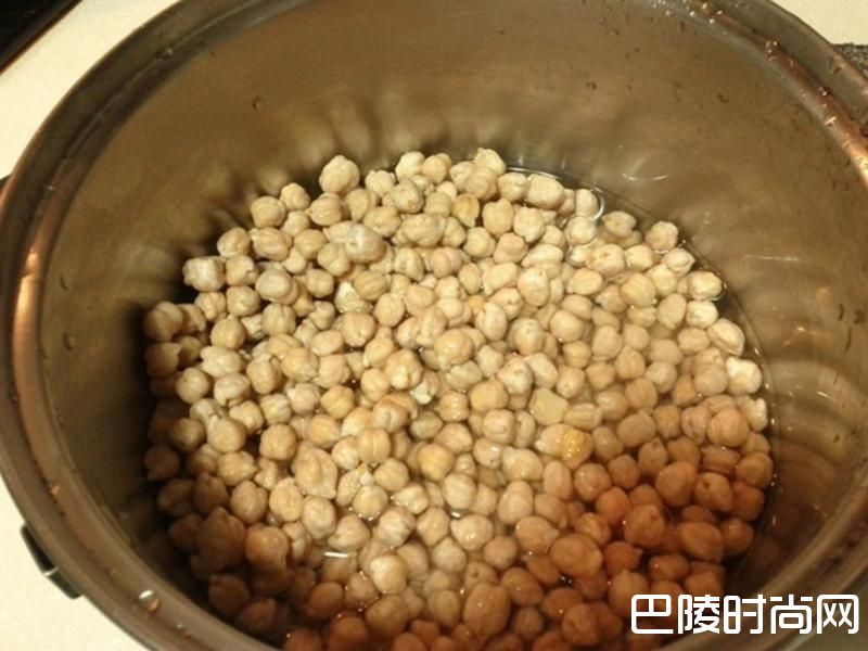 1如果采用熟的鹰嘴豆请跳过此步骤。将干的鹰嘴豆泡水一夜,将泡完水的鹰嘴豆煮滚30分钟左右,待吃起来像蒸熟的花生的硬度即可,保留煮豆水备用