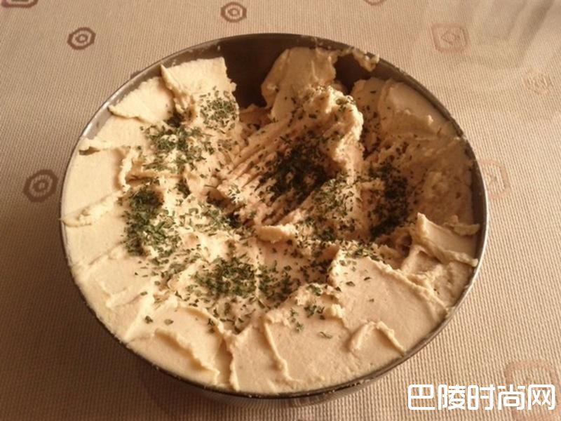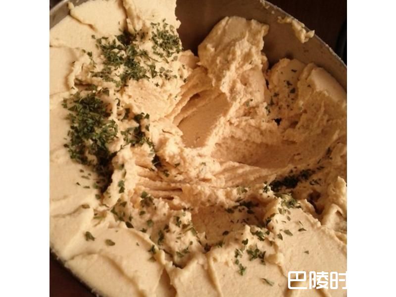 3将熟鹰嘴豆,Tahini酱,柠檬汁,大蒜泥,茴香子粉,盐,橄榄油,少许煮豆水(先加入300ml再视黏稠度慢慢加入)放入食物处理机搅拌,确定每颗鹰嘴豆都被打成泥后,用汤匙挖一勺起来,将汤匙反过来,豆泥不会掉下即可,盛盘后洒上洋香菜