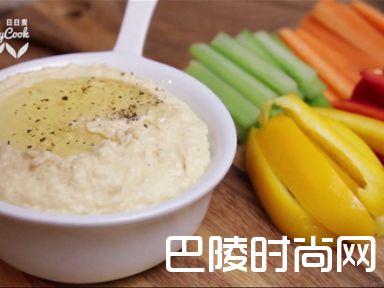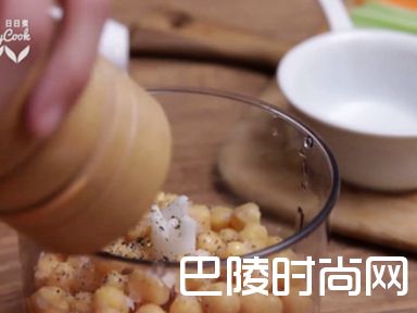 1把鹰嘴豆放入搅拌器中,加入一点橄榄油和胡椒粉,打成鹰嘴豆泥;