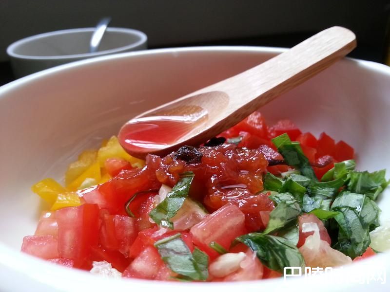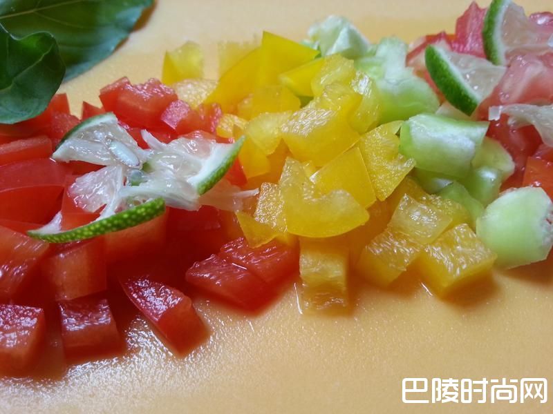 3a:红彩椒、黄彩椒、牛番茄、青花椰去外皮,以上全切丁。b:莱姆皮削取用、榨汁。c:紫苏梅剁碎至绵密。d:萝勒细切