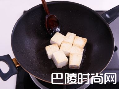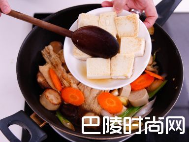 7加入豆腐及红萝卜,再煮3分钟直至酱汁收干