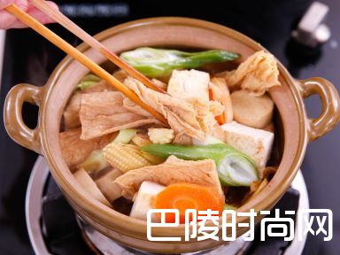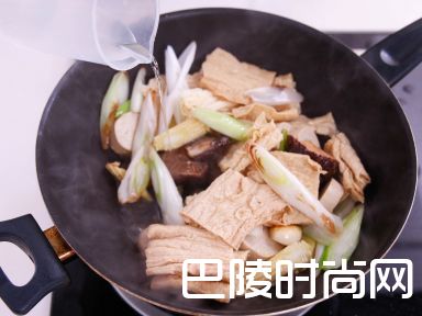 5平底锅,落油,炒香蒜头及姜片,加入大葱丶粟米笋丶冬菇及素鸡,煮3-4分钟
