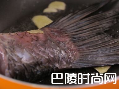 6用中高火烧热锅,加少许油,加入姜片爆香,加入鲩鱼尾煎至两面金黄