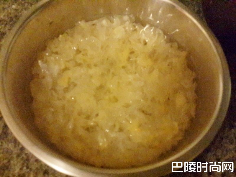3把雪耳撕碎成小块或使用果汁机绞碎我较喜爱撕碎成小块