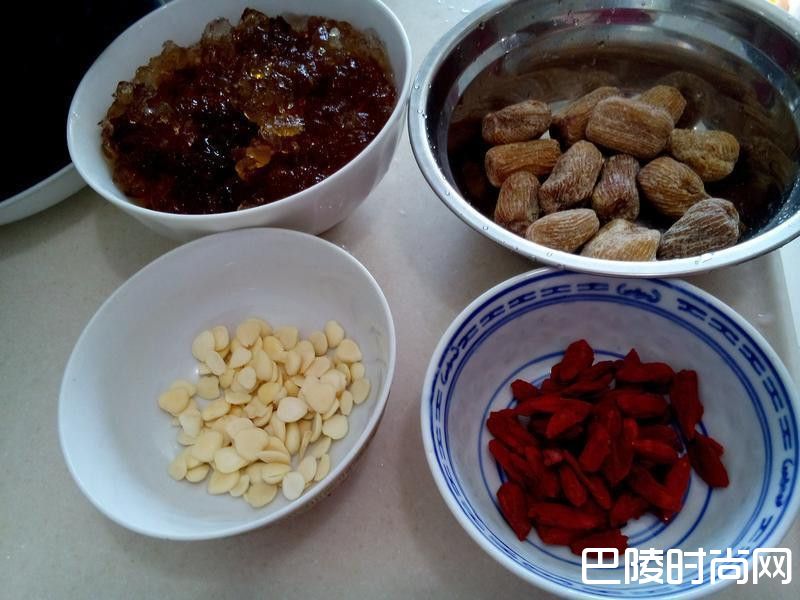 桃胶一两 南北杏半两 宁夏杞子一两 金丝蜜枣150g 水1300g 冰糖40g 做法