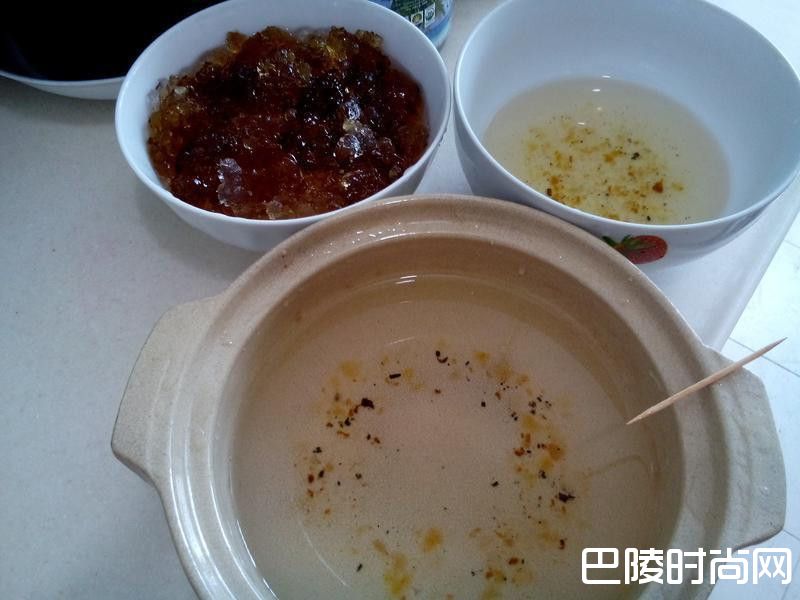 雪莲子20颗左右(皂角米)、桃胶十粒左右,银耳半朵(用量根据自己需要来做,这三种原料水发后会涨大许多,一次不要放太多)、黄冰糖