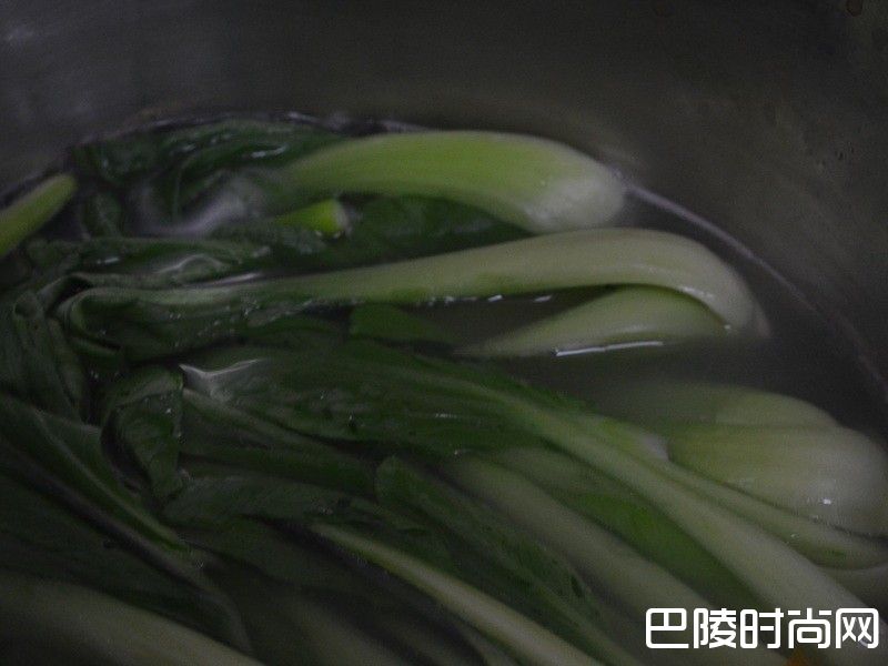 2滚水中加入少许盐与沙拉油放入青江菜汆烫捞起沥干。