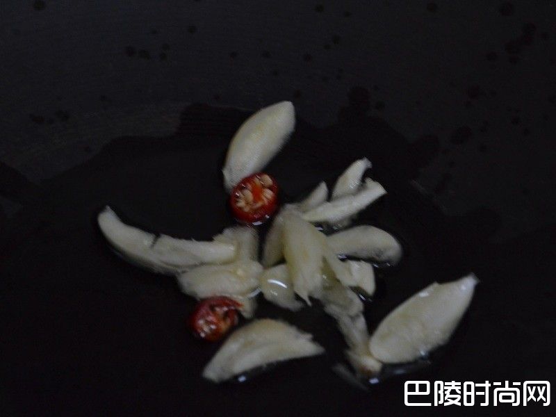 4锅中放入1匙油将蒜头与辣椒爆香。