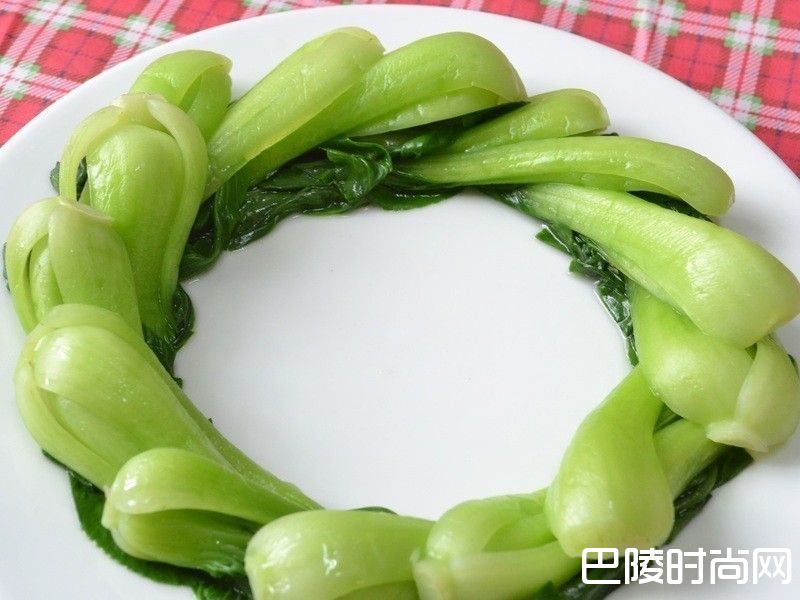 3取一盘子,将汆烫好的青江菜排盘备用。