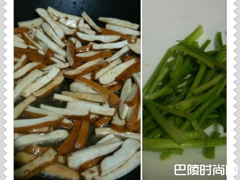 4将豆干丝入锅中炒香, 将豆干丝炒至金黄色