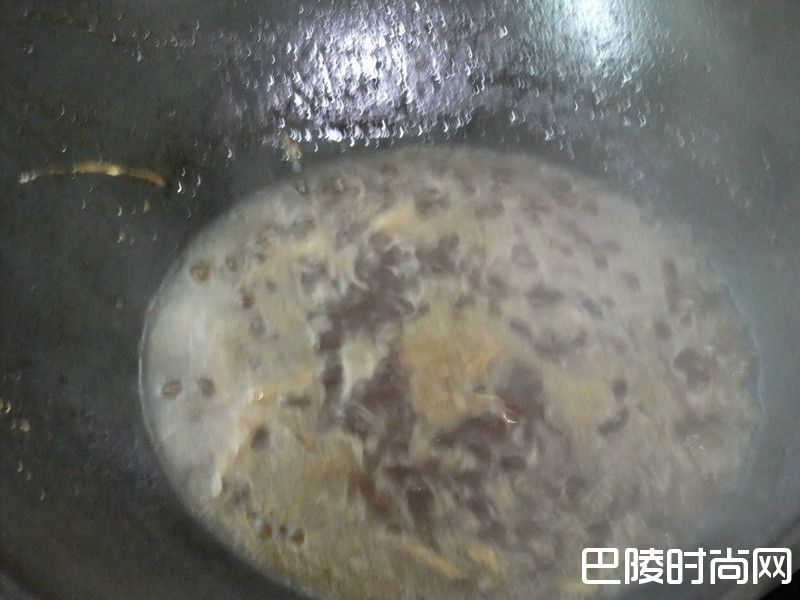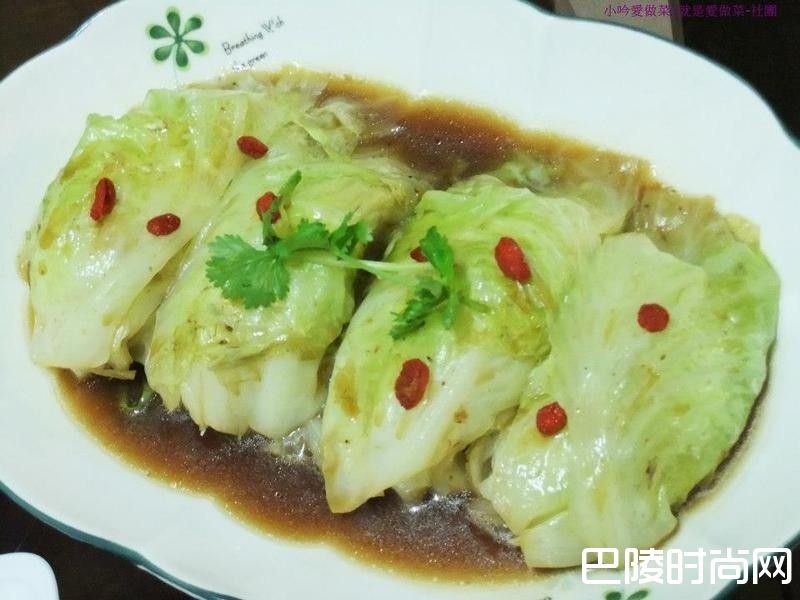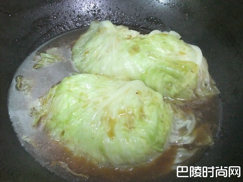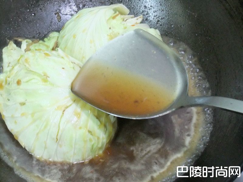 5放入高丽菜→用炒菜勺子舀汤汁淋在高丽菜上数次