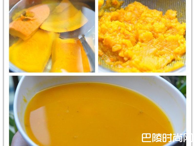3将南瓜连同外皮刷洗干净放入电锅蒸煮祸水煮皆可,再将软化南瓜取出压成碎泥,再放入冷水一起滚煮,最后加少许的冰糖融化(不喜欢过于浓稠的汤底,可以用筛网将南瓜汤过筛一下即可)