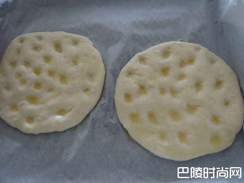 9用手指腹将面团表面压入许多的指凹痕,之后淋上大量橄榄油(可增加酥脆的口感)。