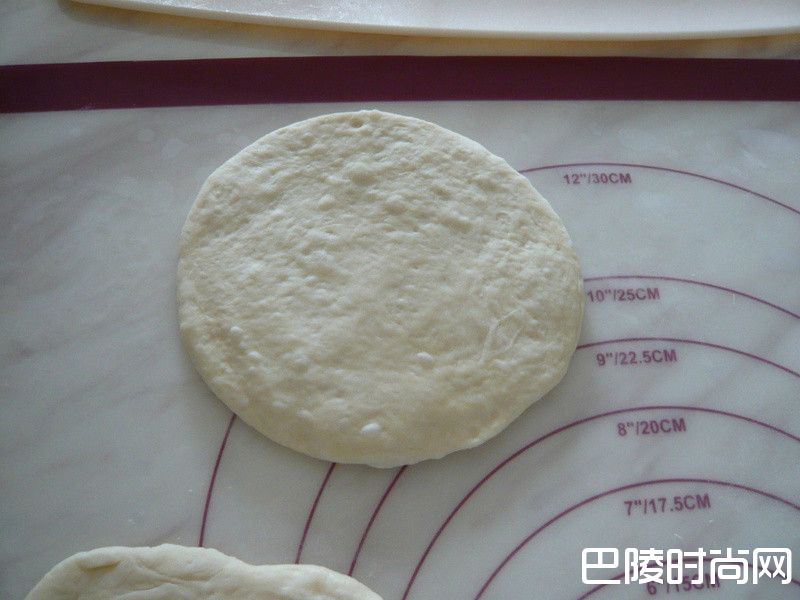 8桌面撒上面粉将松弛好的面团杆成1cm厚的圆片状