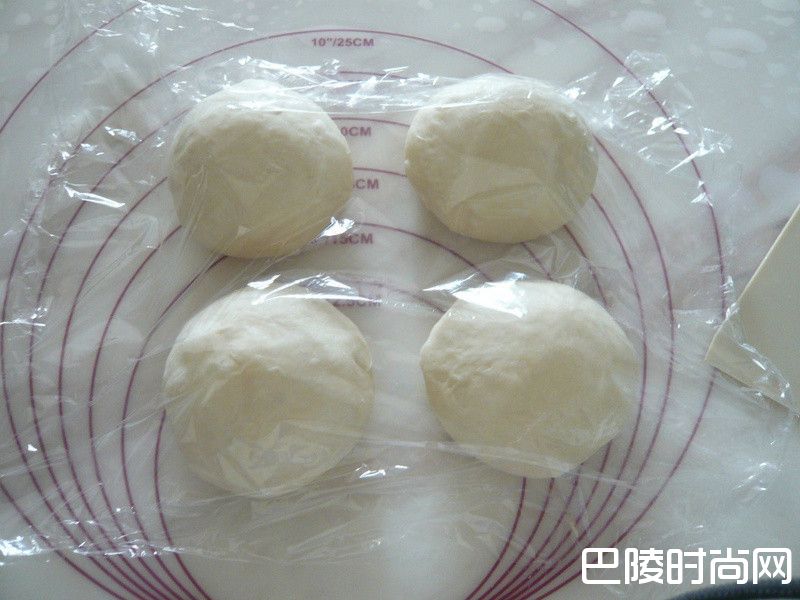 7将发酵至2倍大的面团移出,桌上撒上高筋面粉将面团空气拍出,切割4等份.将面团搓圆并盖上湿布或保鲜膜,放置20分钟让面团松弛