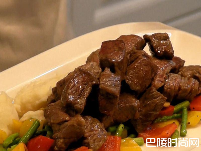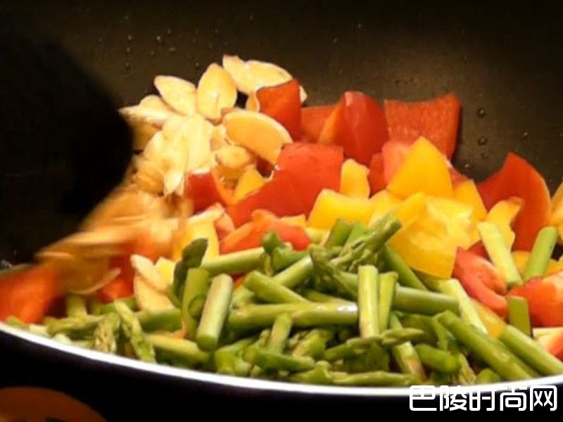 5平底锅放入橄榄油,把蒜片煸一下。煸出香气后,接着加入红黄椒、芦笋一起炒。炒香后加入少许黑胡椒、半小匙盐巴调味,拌炒均匀后关火起锅备用。加入一点橄榄油,接着把牛肉放入平底锅,用中火煎。煎的时候把肉块翻面让四面平均受热,煎到5分熟后关火。