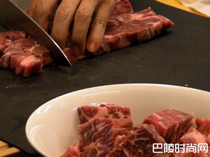 4蒜头切片、芦笋切小段(约3cm)、红黄甜椒切丁(宽约1.5cm),把无骨牛小排切成矩形块状