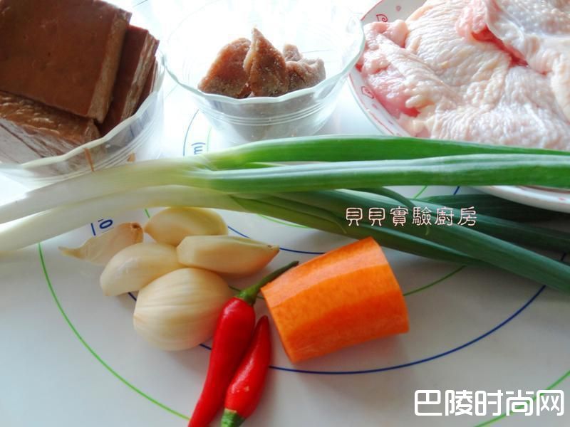 2蒜切片,葱切段,菜脯洗去多余盐份切短,豆干切两半,鸡腿肉切大块备用
