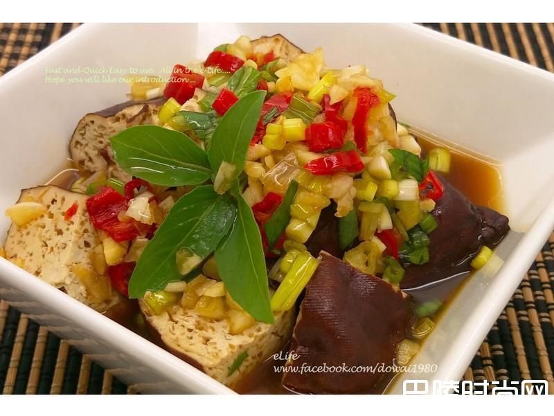 卤汁滚后,放入乌龙茶包,约10分钟后取出。淋酱备料:葱、蒜、九层塔、辣椒切细末备用。