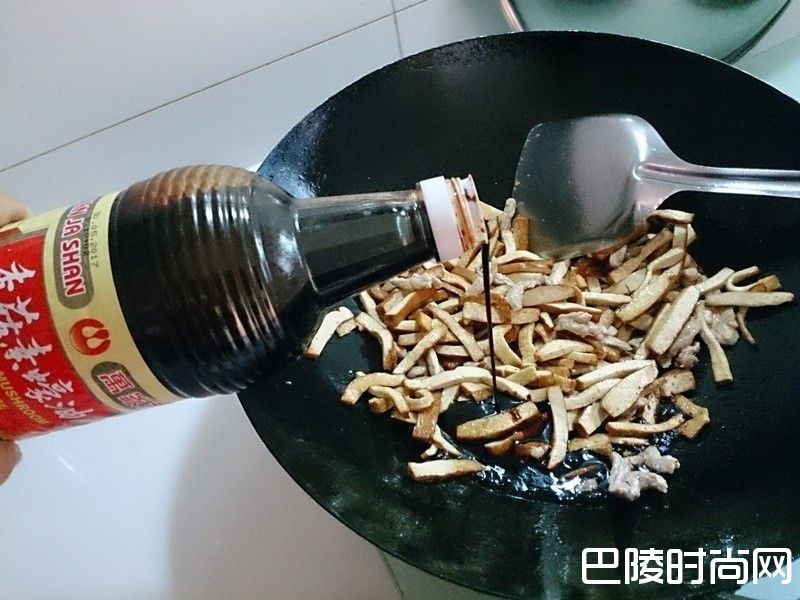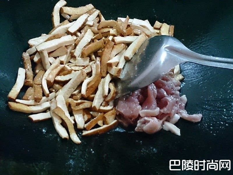 1辛香料肉丝洗净切好备用,豆干切小条
