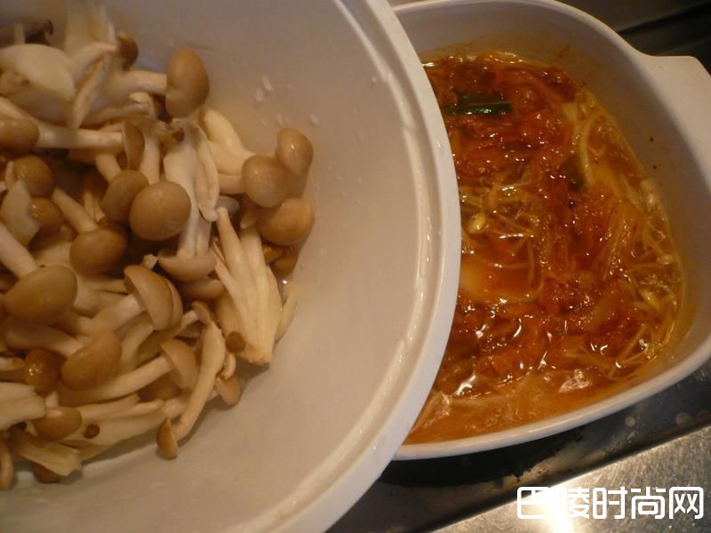 4将好菇道鸿喜菇洗净,用手剥成小块,放入锅内一起煮。