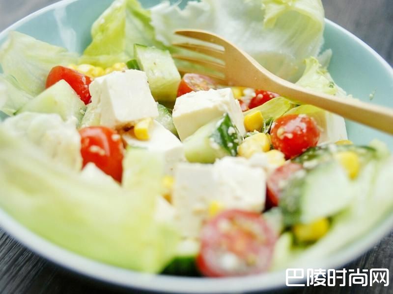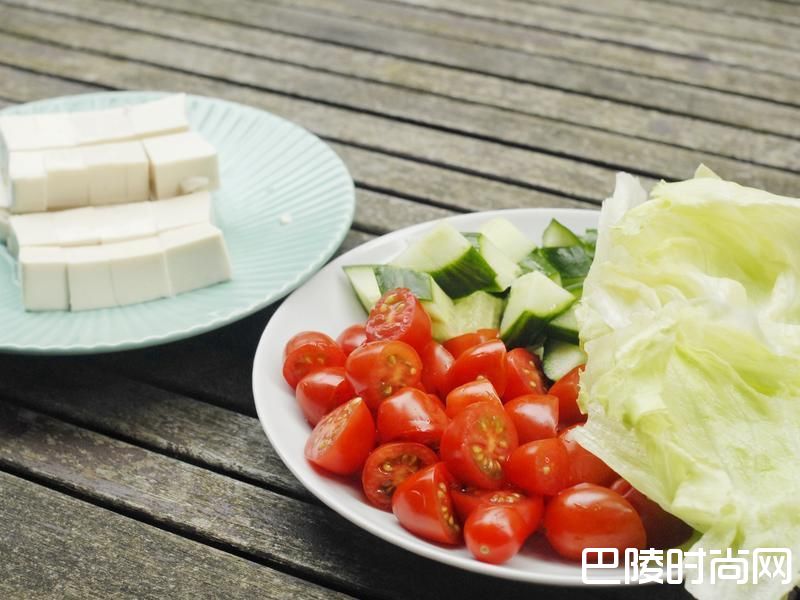 1将豆腐沥干水份,切小块。将小黄瓜切小块,樱桃茄切半