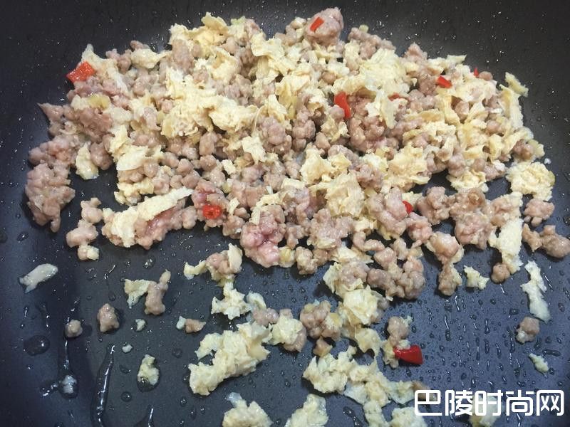 2热油锅,放入姜末、辣椒末爆香,加入绞肉翻炒至变色微乾,再加入冻豆腐拌炒,下青江菜炒匀。