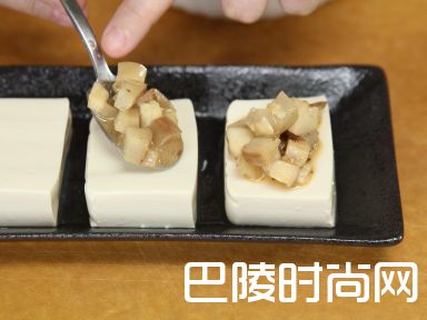 1青江菜切细末、辣椒切小圆片,冻豆腐泡水沥干水分后捏碎,用少许油煎至金黄色微干。