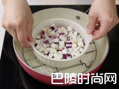 3在镬中倒入水及放入蒸架,水滚后放入茄子蒸3分钟