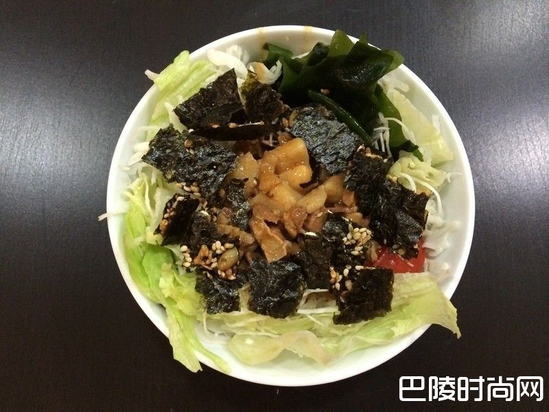 7将酥脆的元本山红曲南瓜子海苔用手随意折成好几片以中画圆洒在料理上就完成囉~
