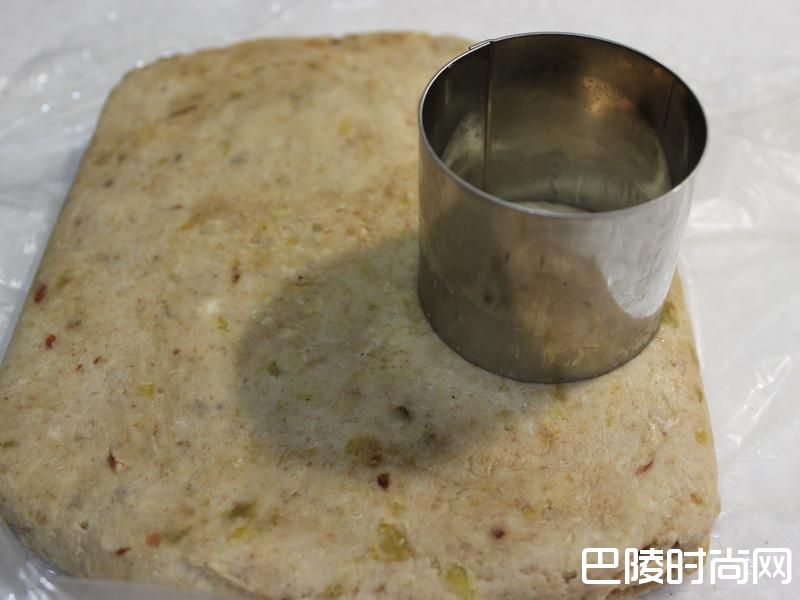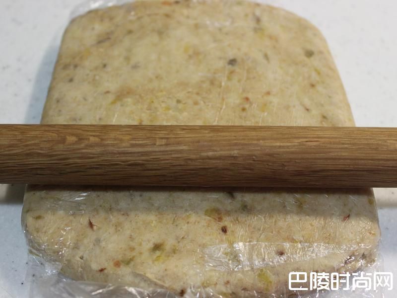 4取出面团,隔着保鲜膜用擀面棍擀压约2cm的高度。