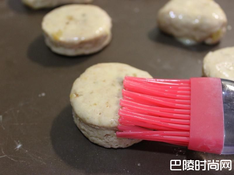 6于司康表面涂上蛋液后,接着放入以180度已预热10分钟的烤箱,烤约15~18分钟,充满坚果香的司康出炉囉!
