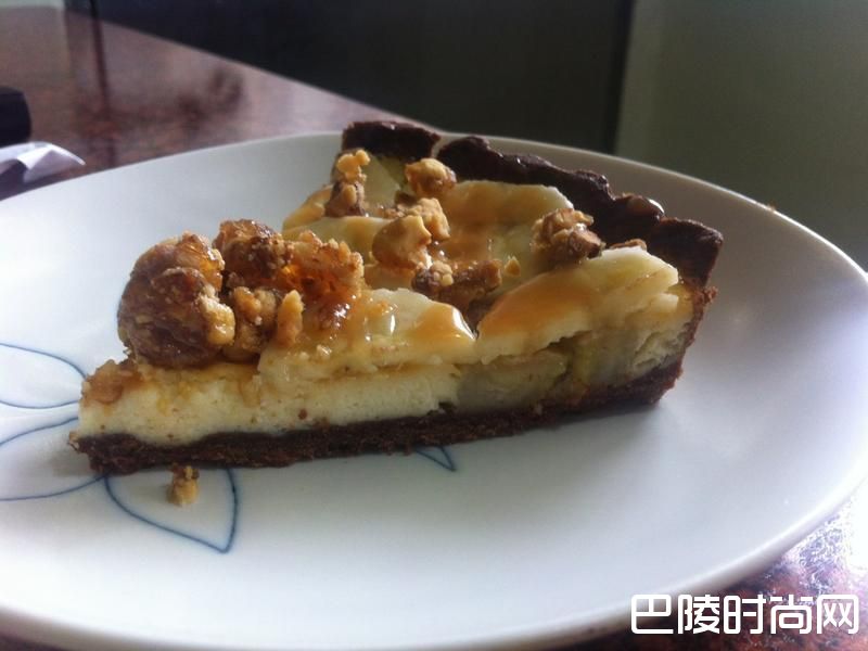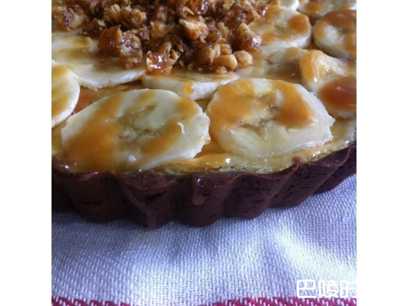 4制作表面装饰:此次制作排上了香蕉切片、放上了焦糖核桃、淋上焦糖酱。
