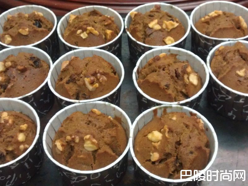 3将面糊填入纸杯烤模中八分满,最上头撒些预留的核桃作为装饰。