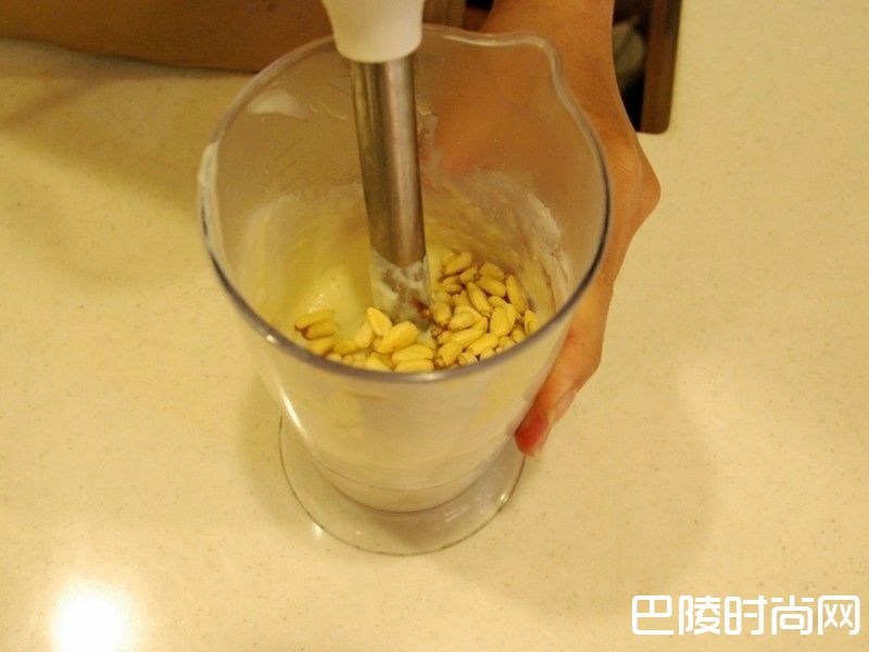 5加入松子,继续搅拌,至肉眼看不出完整松子形状即可。
