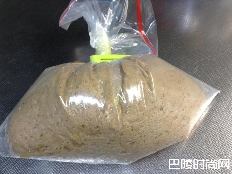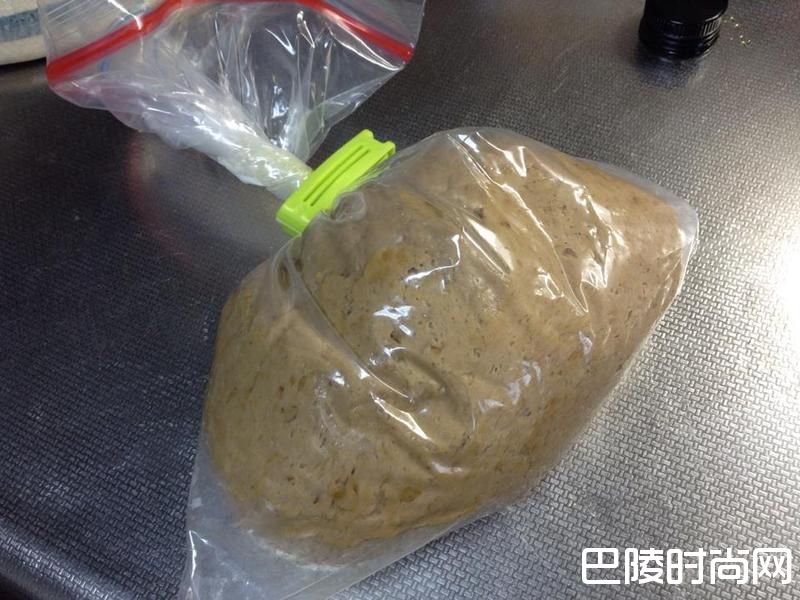 2完成第一次发酵的面团(稍微膨胀即可,不一定要膨胀到2倍),直接放入涂油的厚塑胶袋中,把空气放出来,上面收口要夹紧。(这时约是早上9点)