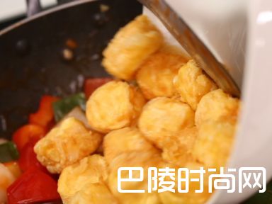 8将日本豆腐及菠萝加入锅中翻炒至均匀沾上酱汁,上碟即成。