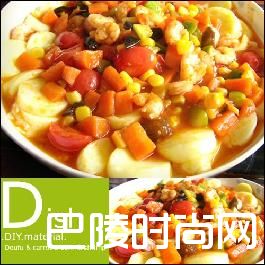 日本豆腐海鲜蔬菜烩日本豆腐,甜玉米,虾仁,小番茄,黄瓜,胡萝卜,木耳