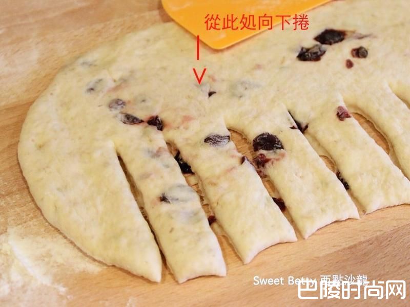 4桌上撒些面粉,将面团擀成长30*宽20cm,再于宽的1/2处切割条纹,最后再从上面(即未切割处)向下卷起,收口压紧放置烤盘即可