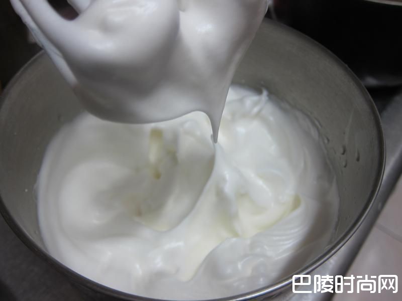 4蛋白双的制作:蛋白+柠檬汁打至轻微起泡。 分2-3次糖加入打至蛋白湿性发泡蛋白霜。