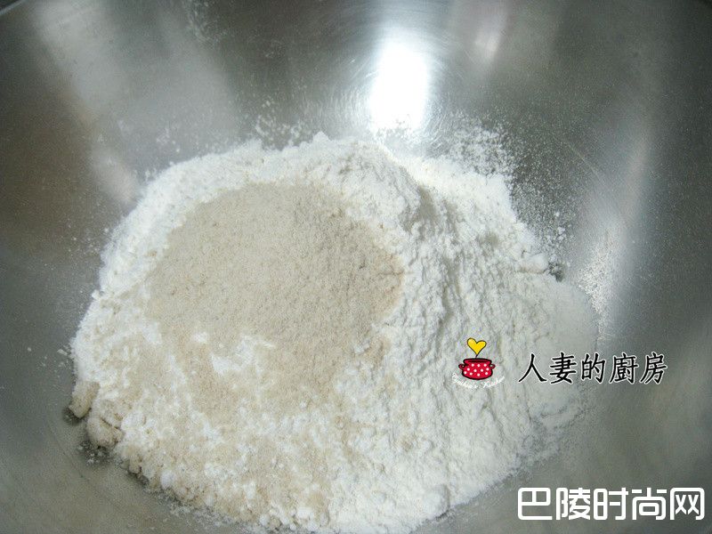 1先将干料放置一个钢盆(注意,酵母不要与糖及塩混到,分开放)。