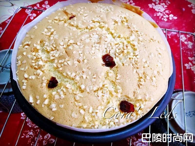 4准备七吋模,底部与边边皆放烘焙纸。作法三倒入这,用力震两三下,上面均匀洒上杏仁角。入烤箱~先预热15分,180度烤35-40分,即可。出烤箱后,蛋糕倒扣,待凉再食用。