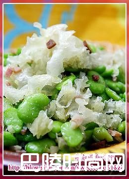 银耳火腿烩蚕豆新鲜蚕豆瓣半斤,火腿4片,泡发好的银耳6朵,葱碎,姜碎少许,糖一小撮,盐适量