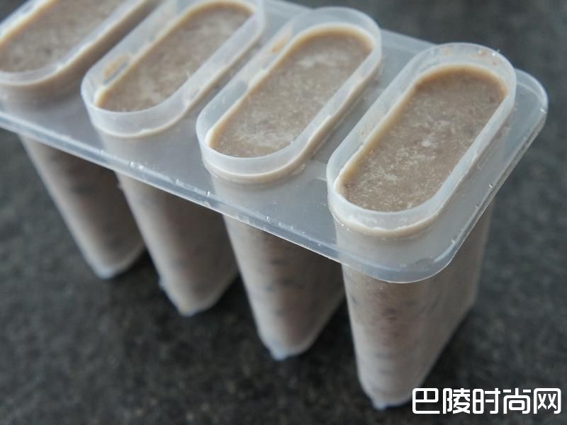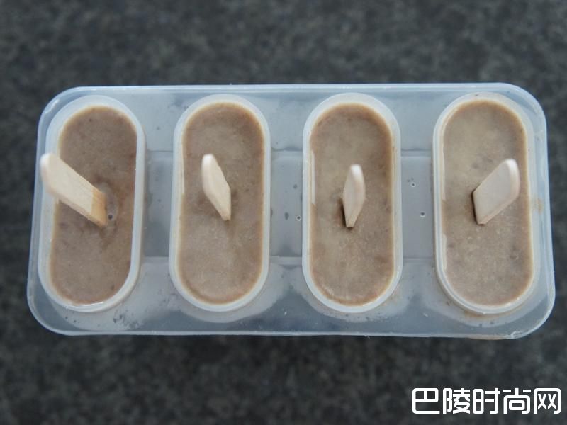 4放入冰箱冷冻1-2小时至半固化后,插入小木条,再放回冰箱冷冻至完全固化。脱模时,将冰棒静置一会或冲一下冷水即可
