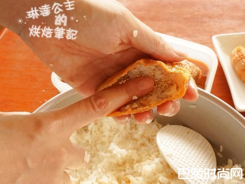 5打开豆皮,用挤过豆皮的手抓起一坨饭捏紧,手上有酱汁比较不会黏米饭