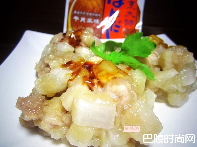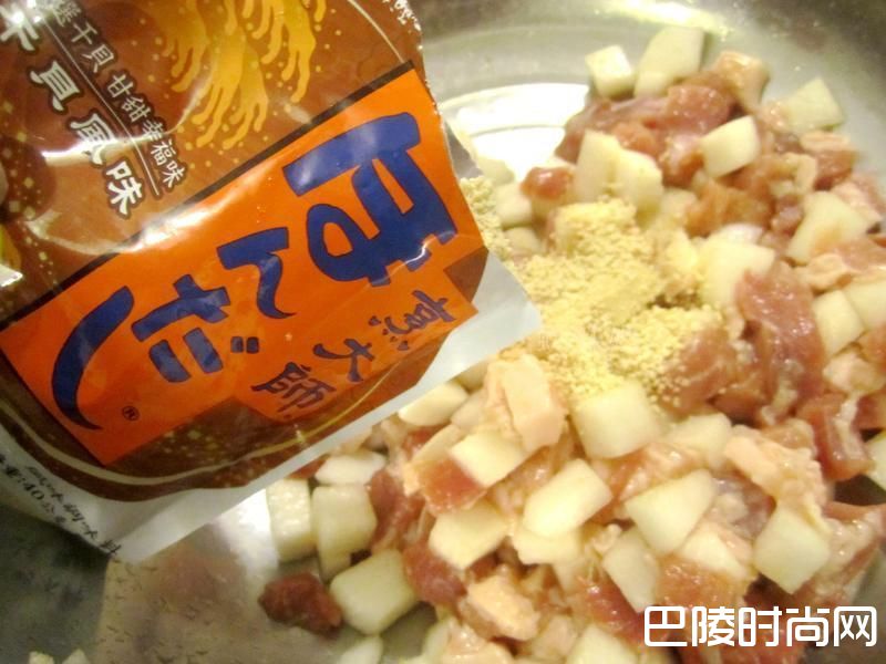 2把姜末、绍兴酒、盐、细砂糖、胡椒粉和烹大师-干贝风味一起加入已经醃制好的白萝卜肉丁里,搅拌均匀;