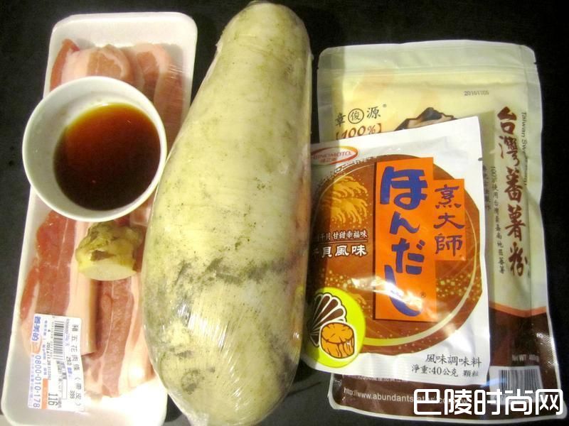 1白萝卜清洗干净,切萝卜丁,五花肉清洗干净,切肉丁,混合在一起后,加入绍兴酒醃制15分钟;