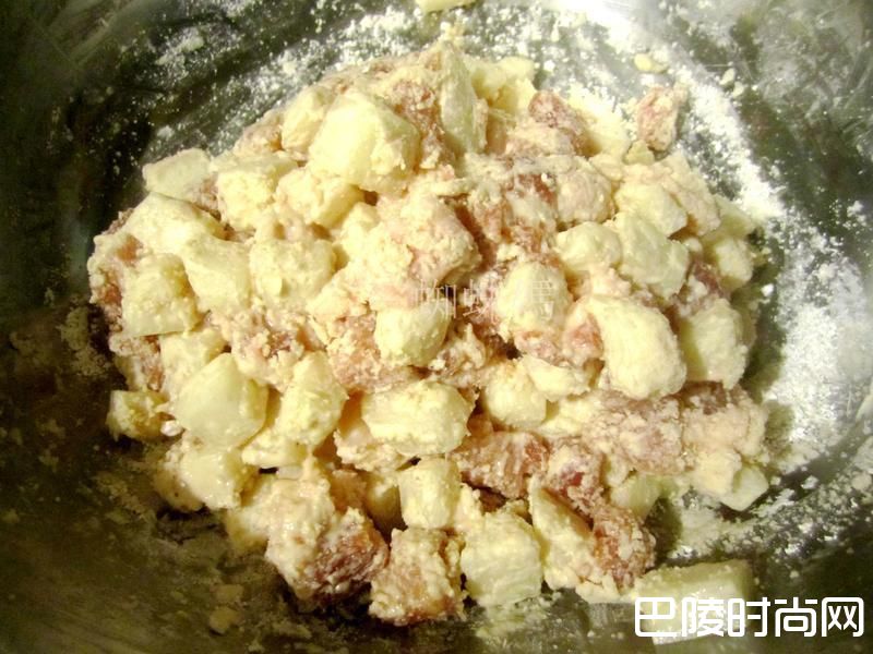3 加入适量地瓜粉,抓均匀,使所有材料